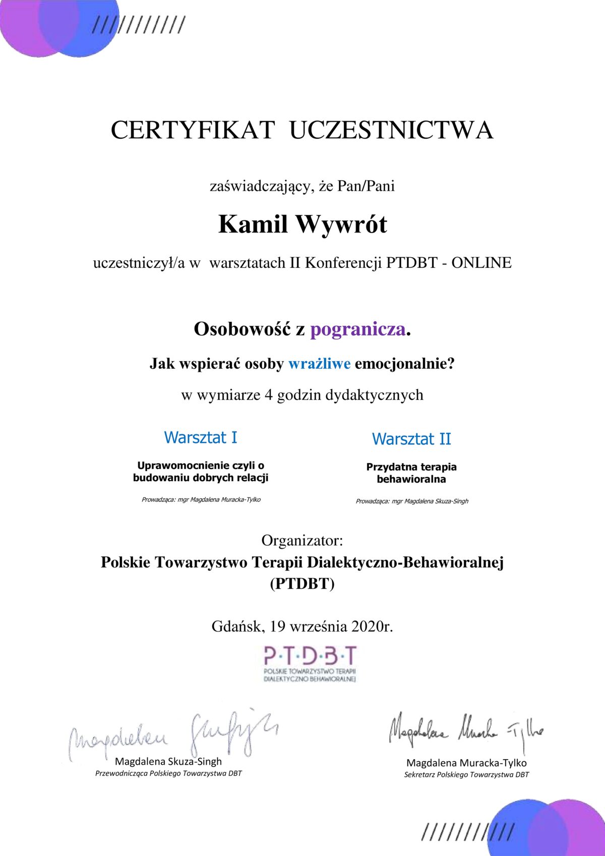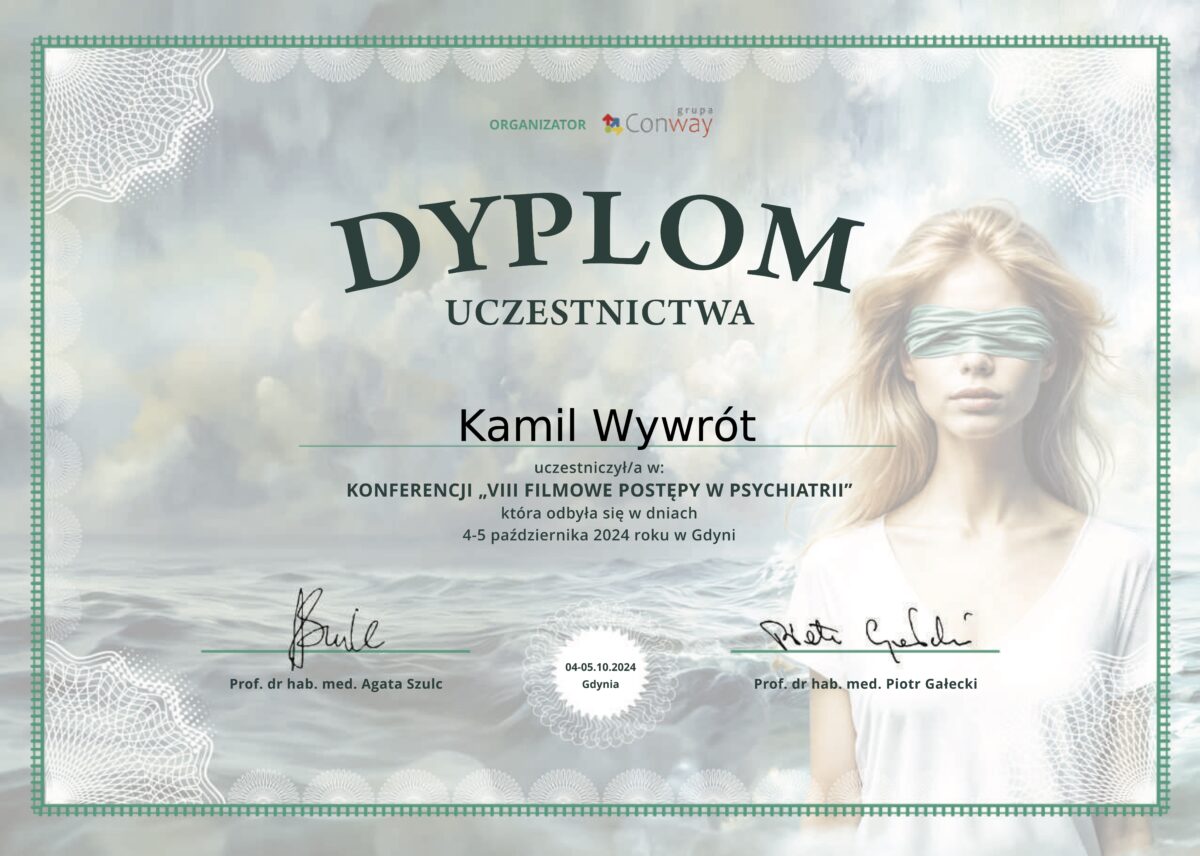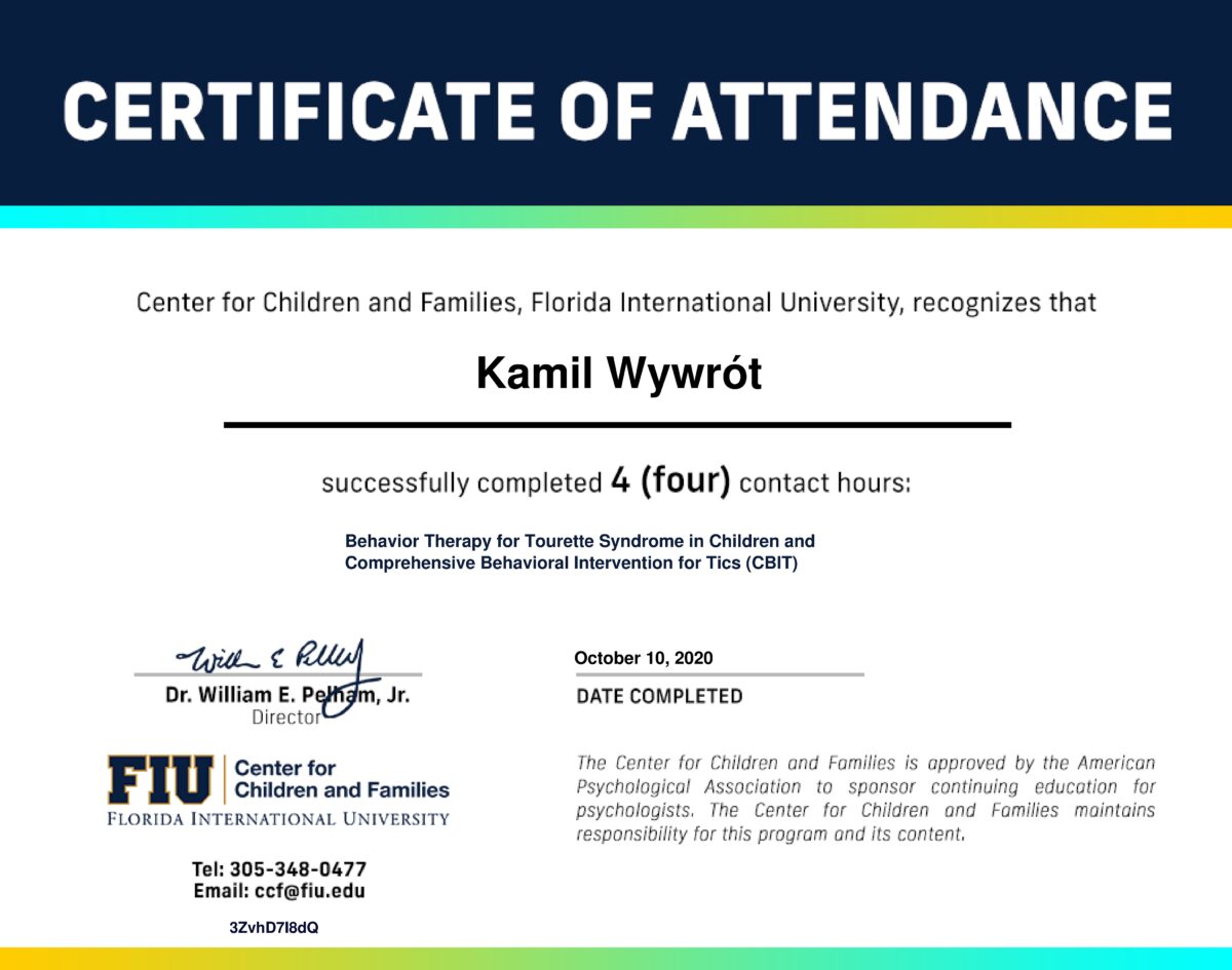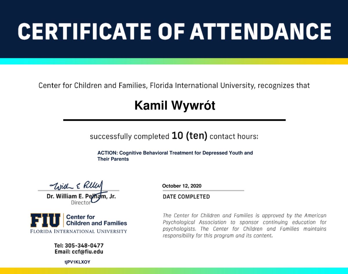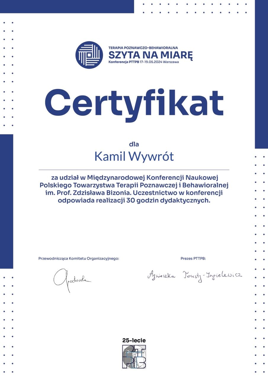 Jestem certyfikowanym psychoterapeutą poznawczo-behawioralnym, członkiem Polskiego Towarzystwa Psychoterapii Poznawczej i Behawioralnej im. Zdzisława Bizonia (Certyfikat Psychoterapeuty PTTPB nr 1081). W obecnej kadencji władz Towarzystwa pełnię funkcję wiceprzewodniczącego Sądu Koleżeńskiego.