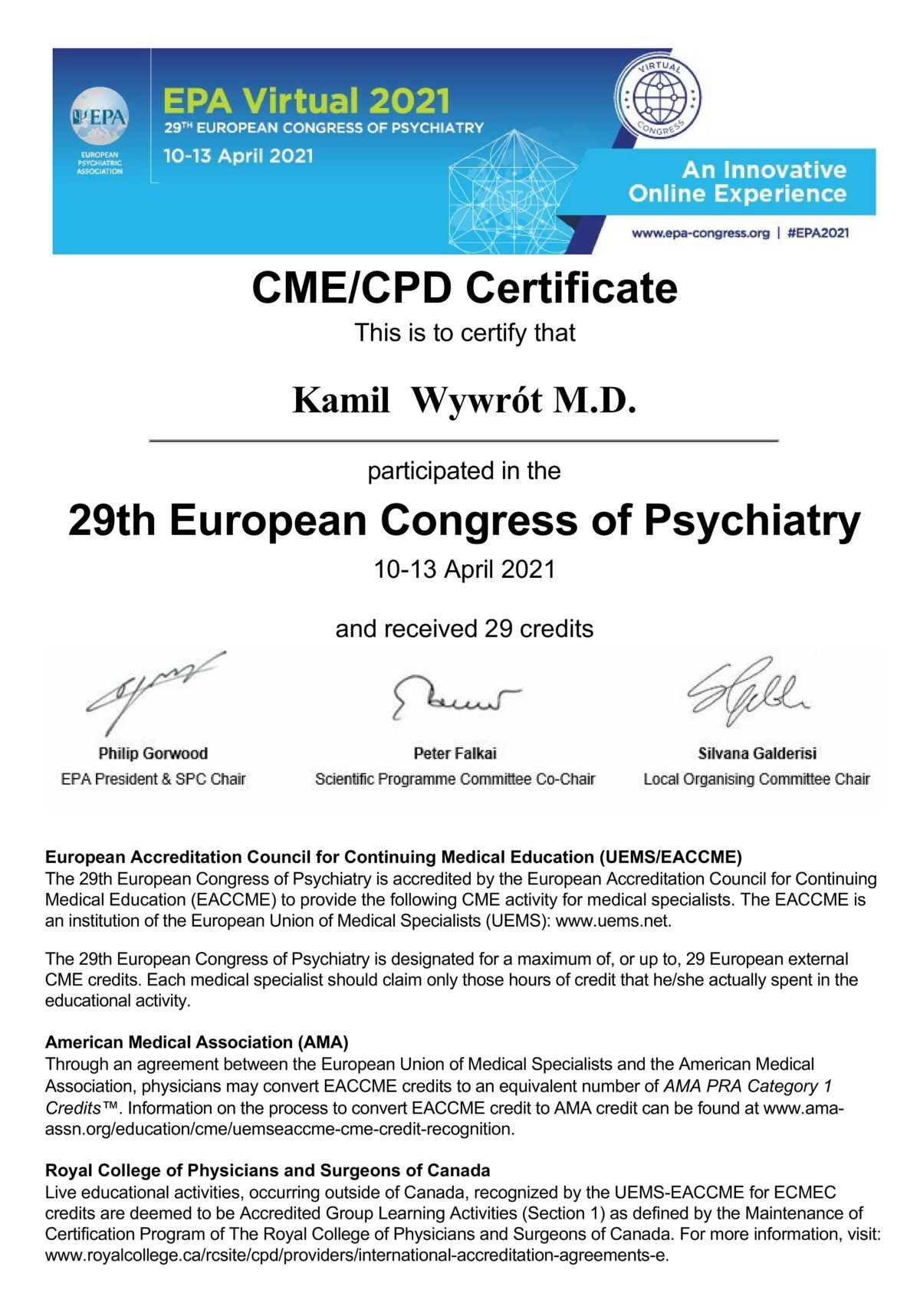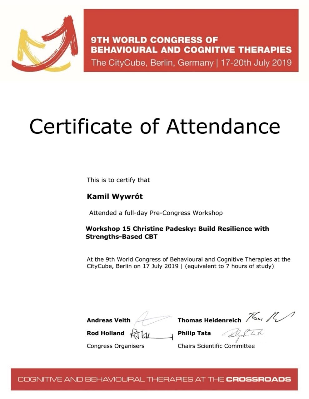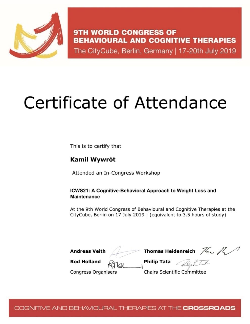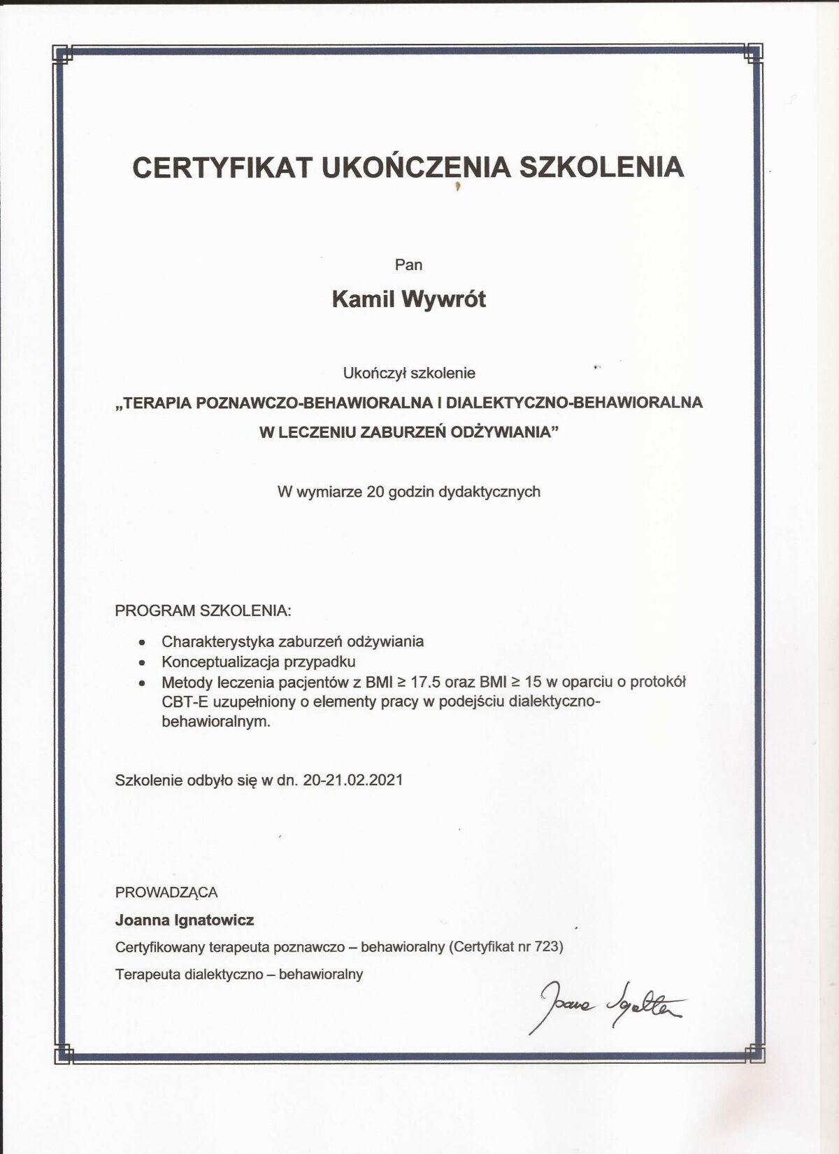 Jestem certyfikowanym psychoterapeutą poznawczo-behawioralnym, członkiem Polskiego Towarzystwa Psychoterapii Poznawczej i Behawioralnej im. Zdzisława Bizonia (Certyfikat Psychoterapeuty PTTPB nr 1081). W obecnej kadencji władz Towarzystwa pełnię funkcję wiceprzewodniczącego Sądu Koleżeńskiego.